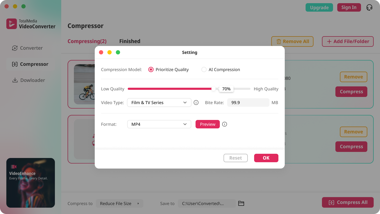 TotalMedia focuses on high quality compression with smart automation and flexible control. Users can compress video files in 4k while checking output size before export. The built-in tools also help reduce file size without a major drop in visible clarity.