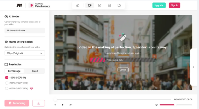 - Preview, enhance, and export. Use the split-screen preview to verify the result, then click Enhance. Download your finished file in MP4 when processing is complete.