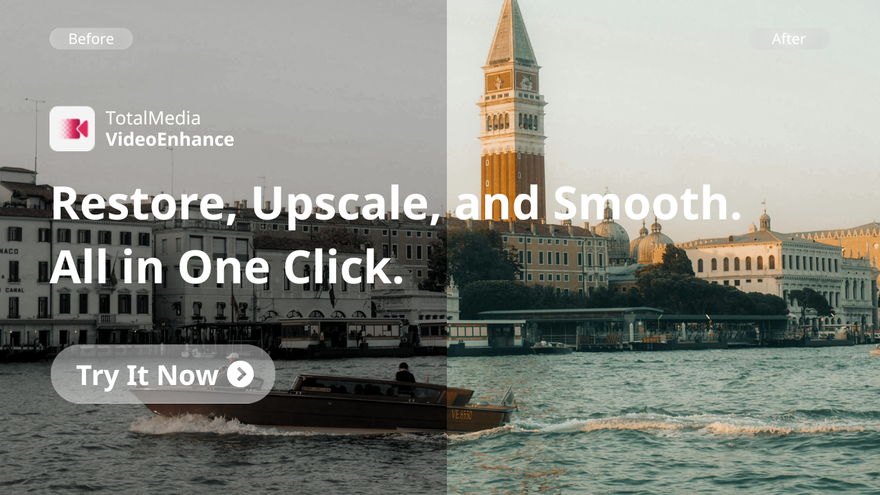 TotalMedia VideoEnhance can either runs entirely in your browser or locally. Upload a video, and the AI Smart Enhance engine gets to work: reducing noise and grain, restoring color balance, sharpening lost detail, and reconstructing edges that compression has degraded. All in a single automated pass.