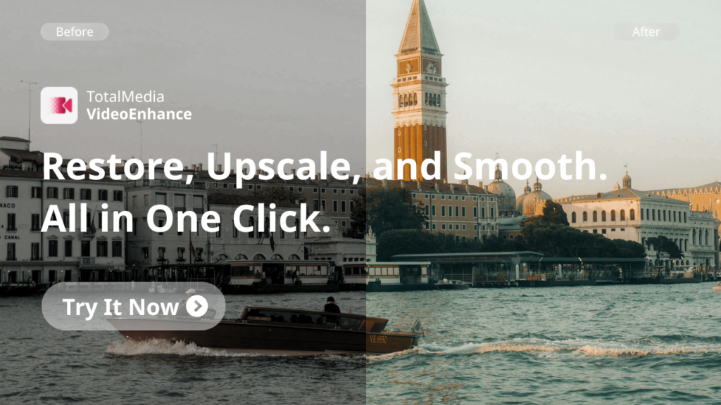 For footage in that state, an enhancement pass before upload makes a real difference. TotalMedia VideoEnhance’s AI Smart Enhance processes noise, compression artifacts, color fade, and detail loss in one pass. Upscaling brings lower-resolution footage to 1080p with AI-reconstructed detail, giving Instagram’s compression a stronger source to work with. No installation required. Runs in any browser.